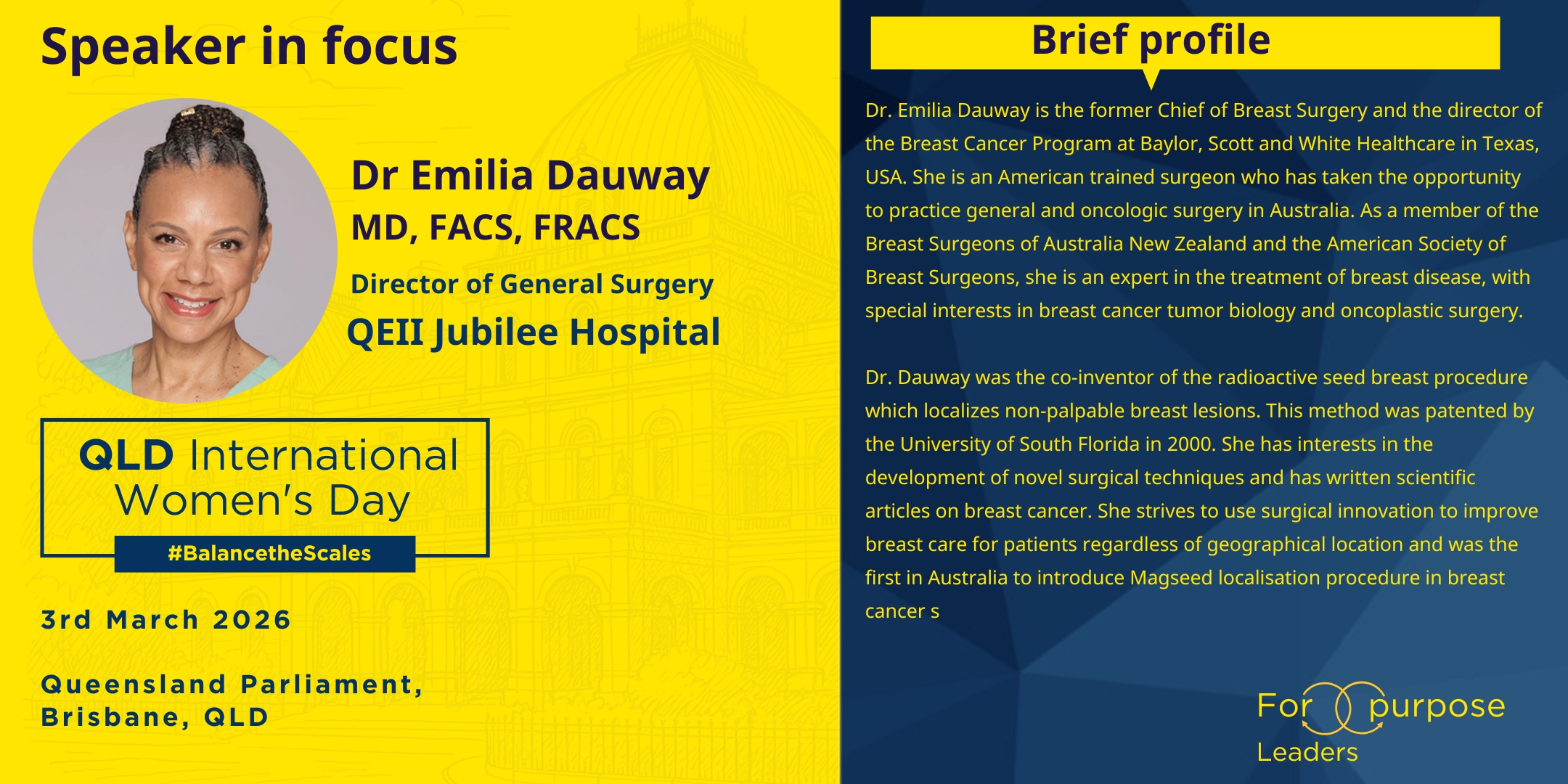 We are delighted to announce Dr Emilia Dauway MD, FACS, FRACS as a featured speaker at the upcoming QLD International Women’s Day – Parliamentary Breakfast Event 2026.