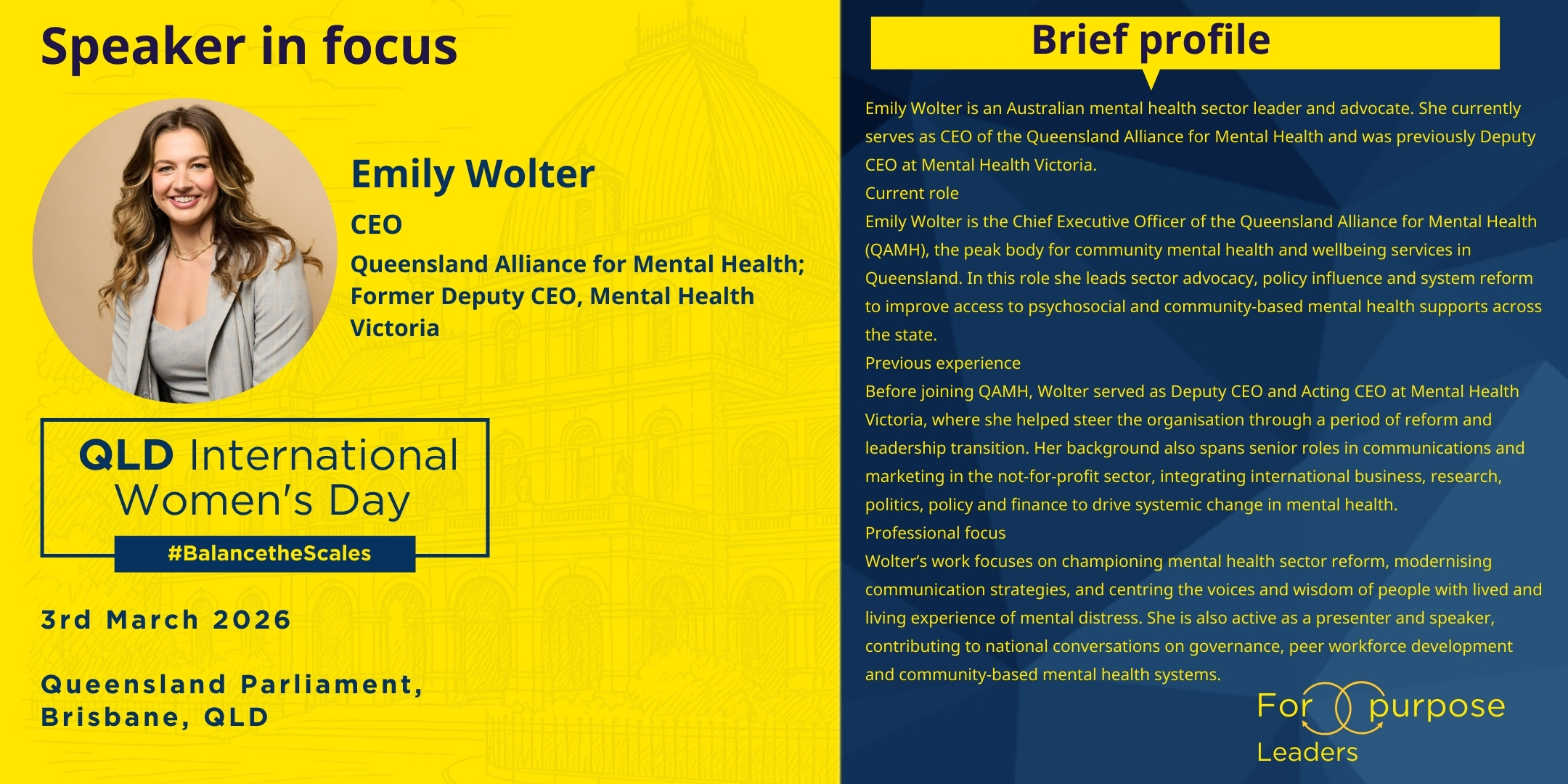 We are absolutely thrilled to announce our next remarkable speaker for the upcoming QLD International Women’s Day – Parliamentary Breakfast Event: the highly respected Australian mental health sector leader and advocate, Emily Wolter!
