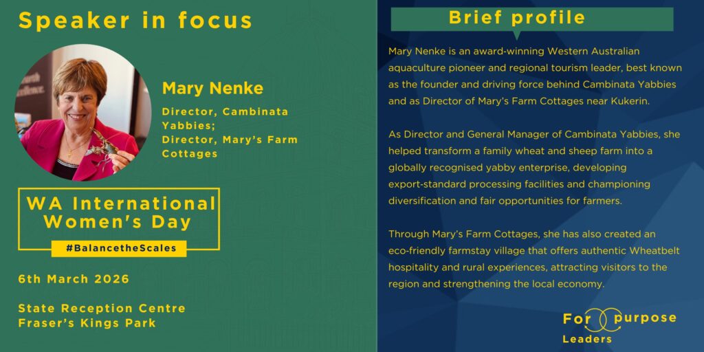 We are absolutely delighted to announce our next remarkable speaker for the WA International Women’s Day 2026 – Leaders Breakfast Event: the award-winning Western Australian aquaculture pioneer and regional tourism leader, Mary Nenke!